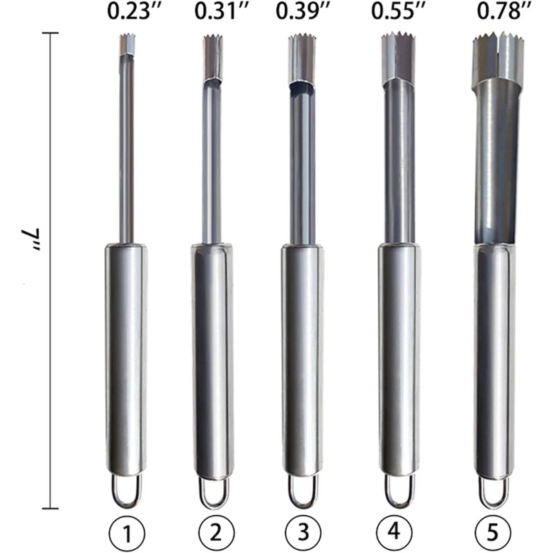 - sizes: Here are 5 diverse sizes of hand-held corer and 1 jalapeno corer, Caliber: 0.78'', 0.55'', 0.39'', 0.31'', 0.23''.