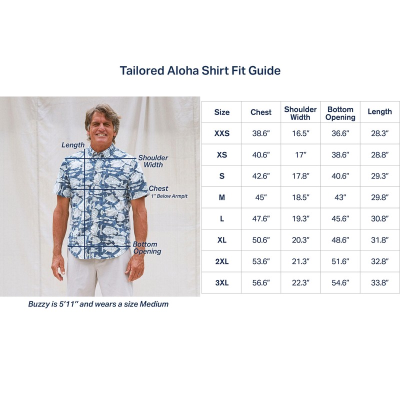 - Multiple Fit Choices: Banzai Biscus comes in multiple fits: Classic Fit Button Front is cut with a little extra room through the chest & body, with side vents and back box pleat for relaxed comfort and traditional Aloha shirt feel; Pullover, a classic fit with a popover 4-button half-placket; and Tailored Fit, trimmer than traditional aloha shirts with a rounded shirt tail for a contemporary and modern untucked look.