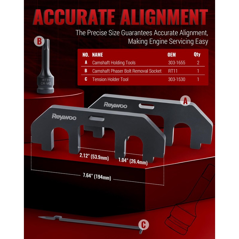 - ACCURATE ALIGNMENT: The camshaft locking tool set firmly fix the parts in place and the phaser bolt removal socket quickly removes the damaged phaser bolt, perfectly replacing those with part number EN 303-1655, RT11, 303-1530