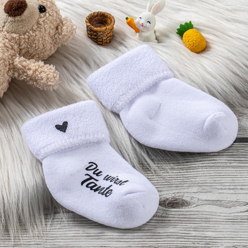 RF&CM Pregnancy announcement, baby socks, white, you will be grandma, grandpa, uncle, aunt, sock edge with heart, Aunt.