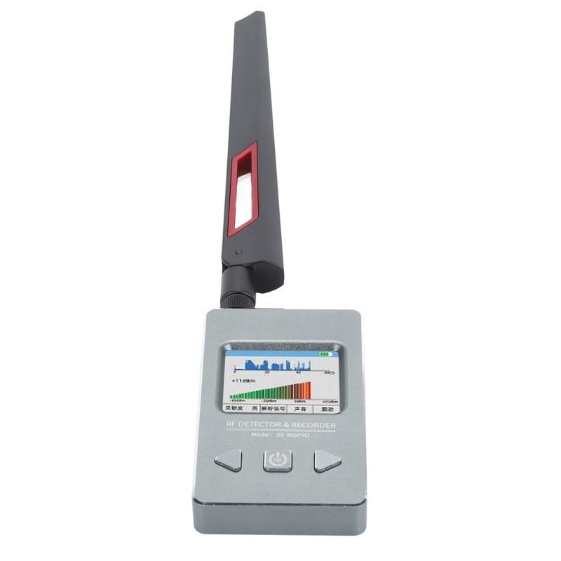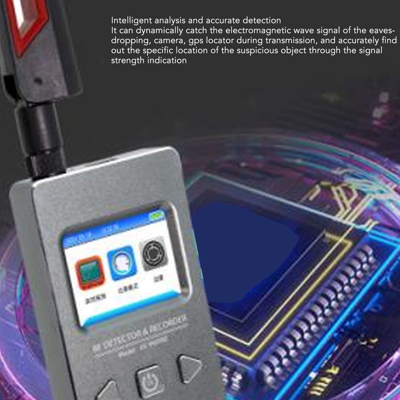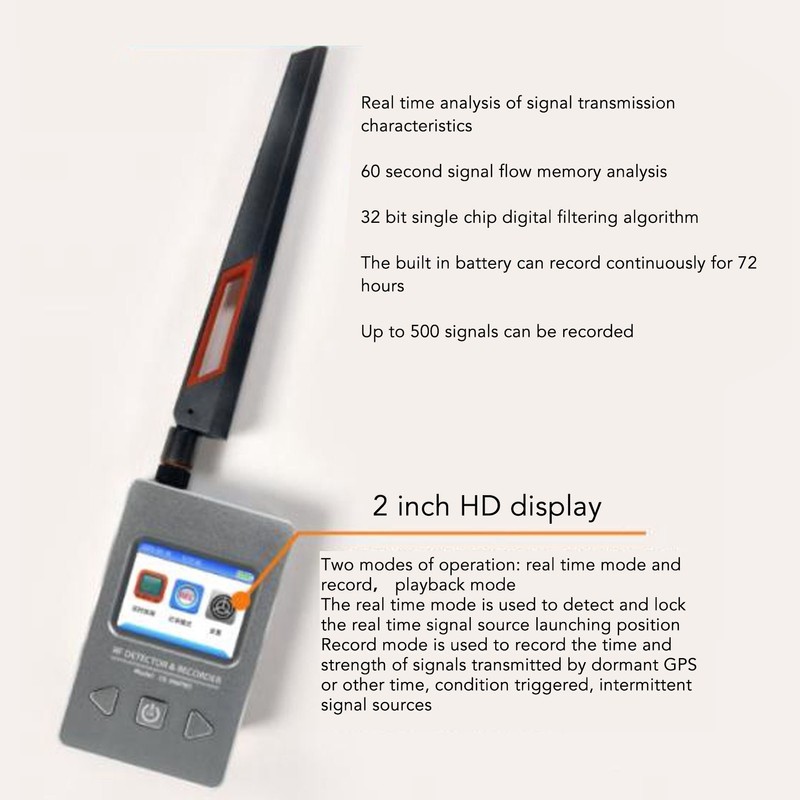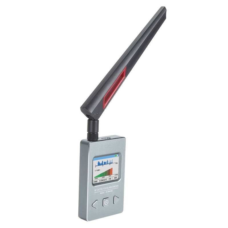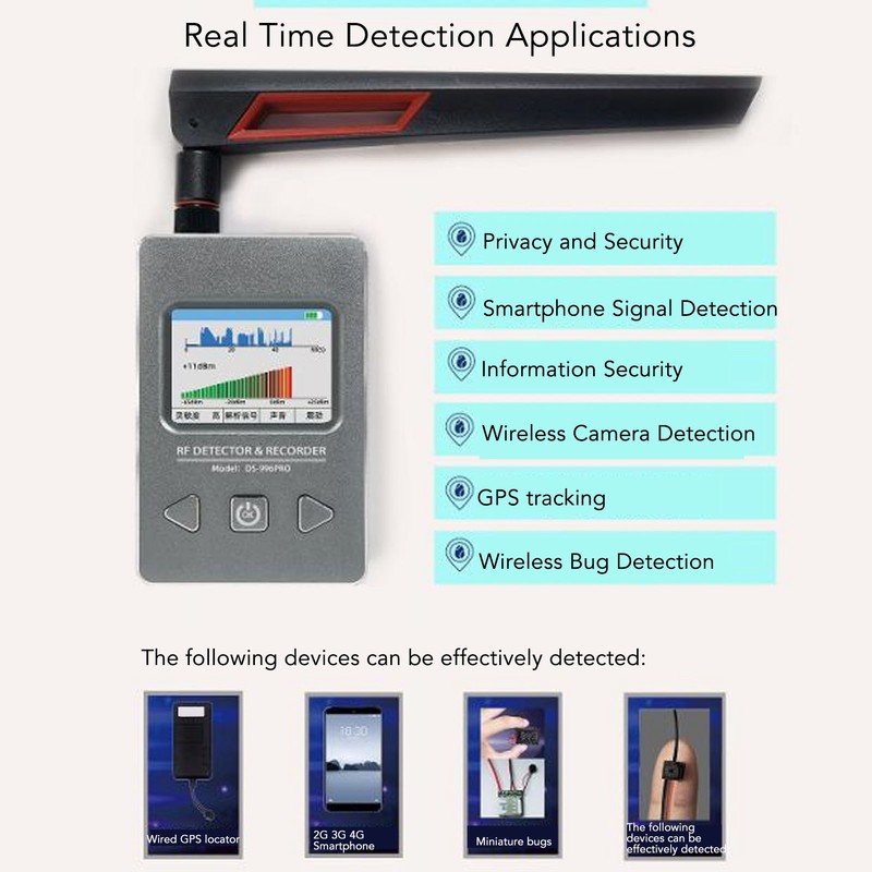 1、Accurate Detection: The RF detector recorder can accurately detect or record devices with electromagnetic wave signals from 10MHz‑4GHz. There are two modes of operation. 2、Real Time Mode: This RF detector is designed with a 2 inch high definition display, real time mode is used to detect and lock on to the location of real time source transmissions. 3、Record, Playback Mode: Record mode records the time and strength information of signals emitted by dormant GPS or other timed, conditionally triggered, intermittently transmitting sources. 4、Applicable Devices: Wireless signal detector can effectively detect smart phones, wireless cameras, GPS locators, wireless bugs, wired GPS locators, 2G 3G 4G smart phones, etc. 5、Application Scenario: Widely used in cars, meeting rooms, locker rooms, hotels, cell phone calls and other scenes to prevent being secretly photographed and eavesdropped on.