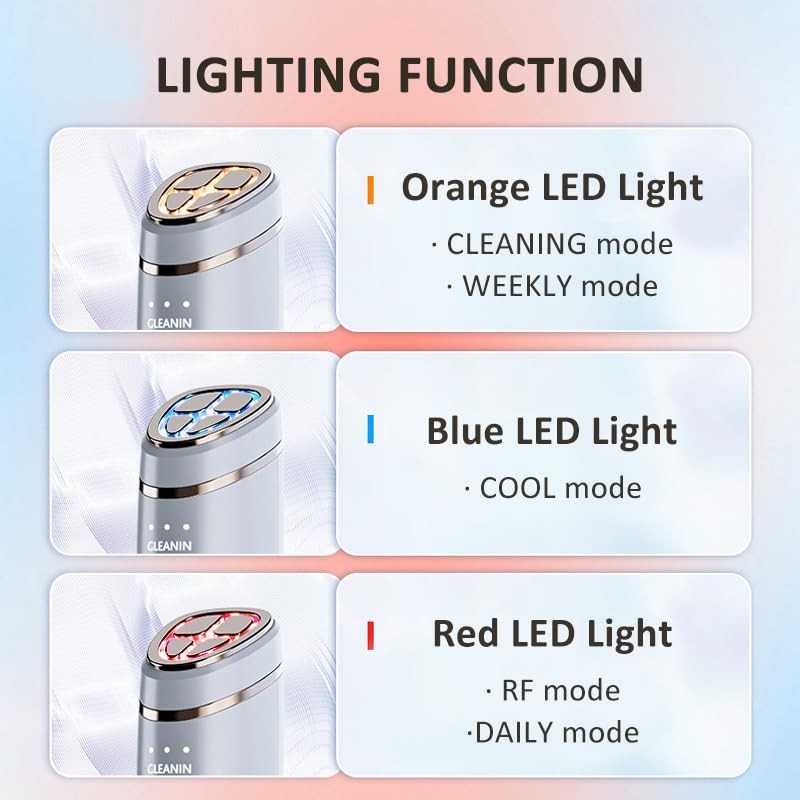 - 3 LED Lights for Targeted Skin Solutions Red Light: Anti-wrinkle, collagen boost, skin tightening Blue Light: Acne care, oil control, deep pore cleansing Orange Light: Brightening, revitalising dull or tired skin
