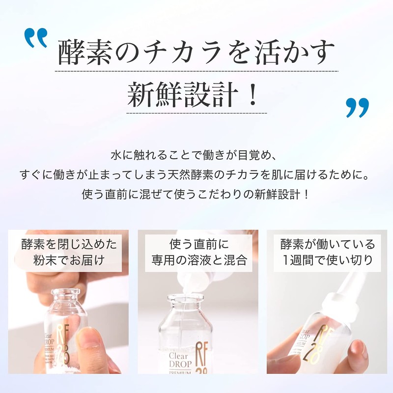 ・1週間に1瓶、使う直前に混ぜて使うフレッシュ製法。新鮮な酵素の力を肌へ届けます。