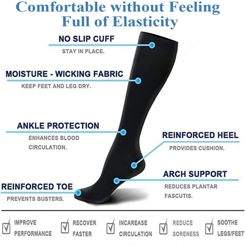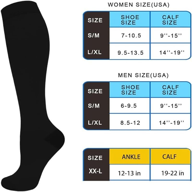 • Gradient Compression Technology - Our compression socks for men and women provide 15-20 mmHg of graduated compression, a top-down pressure curve, increases oxygen supply, accelerates the metabolism of lactic acid, which helps push deoxygenated blood out of the feet and legs and back to the heart. Promote blood circulation to prevent and relieve mild varicose veins, effectively relieve muscle fatigue, and improve sports endurance. Suitable for long periods of sitting or standing, endurance sports, flying and traveling, post-workout recovery, pregnancy, spider and varicose veins.