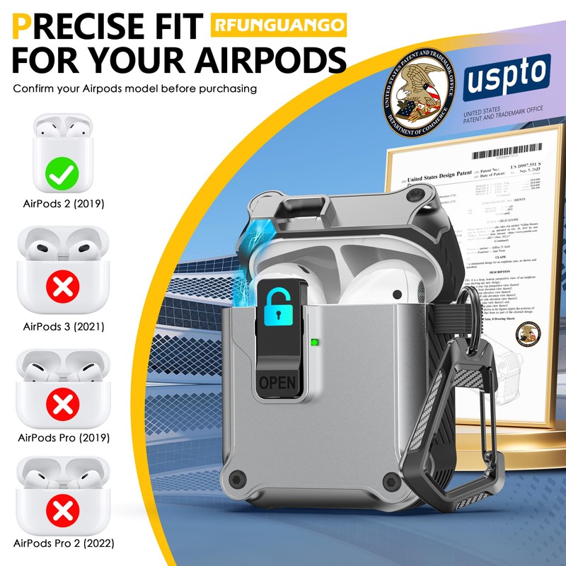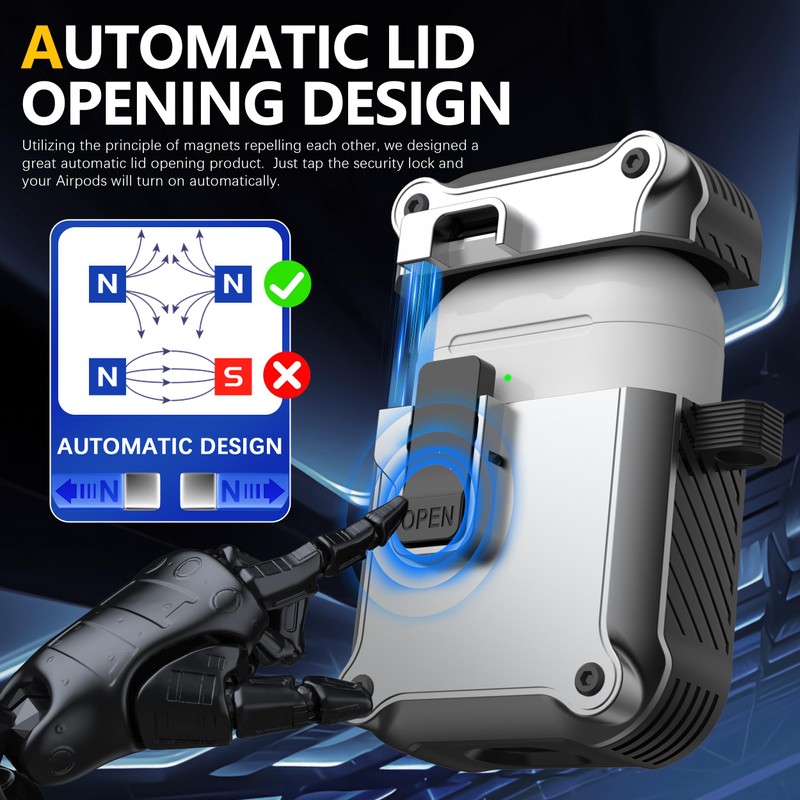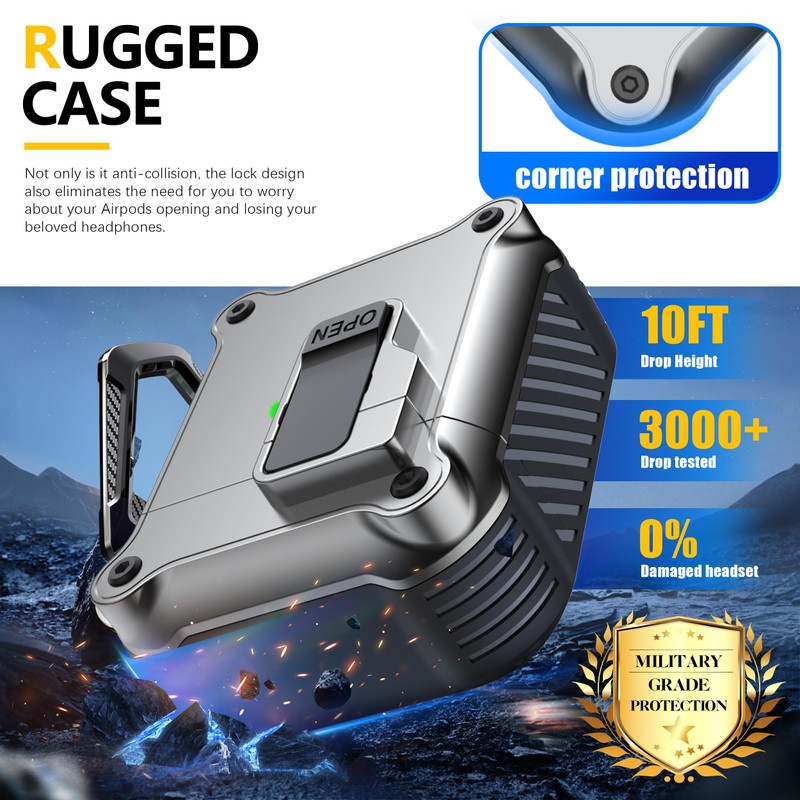 - 【Unique Security Lock & Automatic Pop-up】 Upgraded security lock design makes it easier to open and close.Press the "OPEN" button, the top of the case will automatically pop open. Keeps the AirPods charging case well closed and ensures that the cover never falls off.