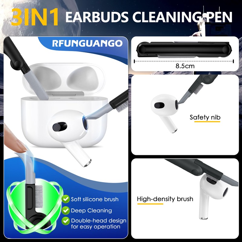 - 🥇Multi-functional Cleaning Pen: The Airpod cleaning Kit has Silicone nib to remove dirt from hidden cracks and holes. The soft flocked sponge absorbs fine dust inside the wireless earbuds charging case. The high-density brush can easily clean the dirt on the sound hole of the earphone.