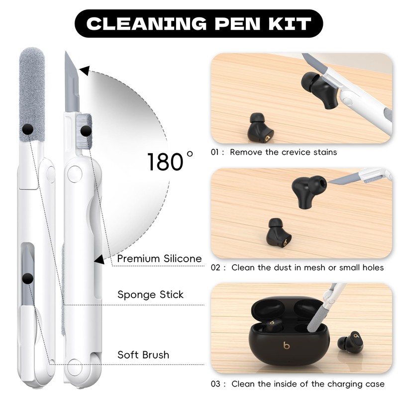 - 【Multifunctional Cleaning Pen】The pen tip can remove stains from gaps, the microfiber brush can remove dust from meshes or small holes, and the flocked sponge can clean the inside of the charging box; in addition to cleaning earphones, it can also be used to clean mobile phones, keyboards, and other electronic devices.
