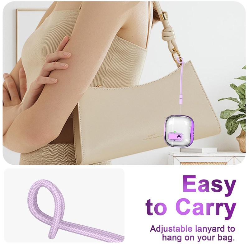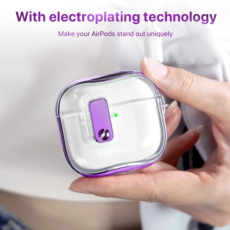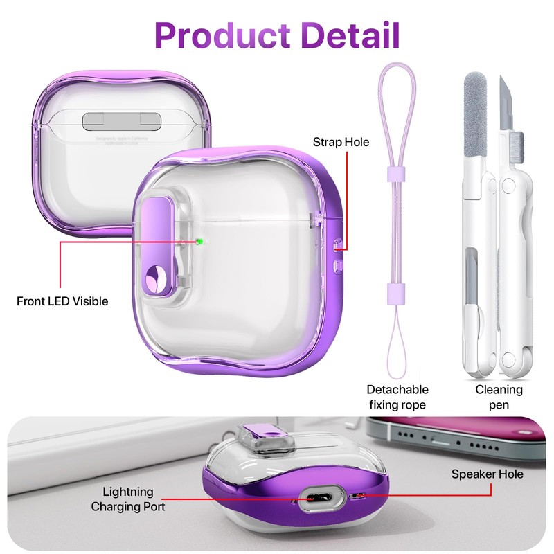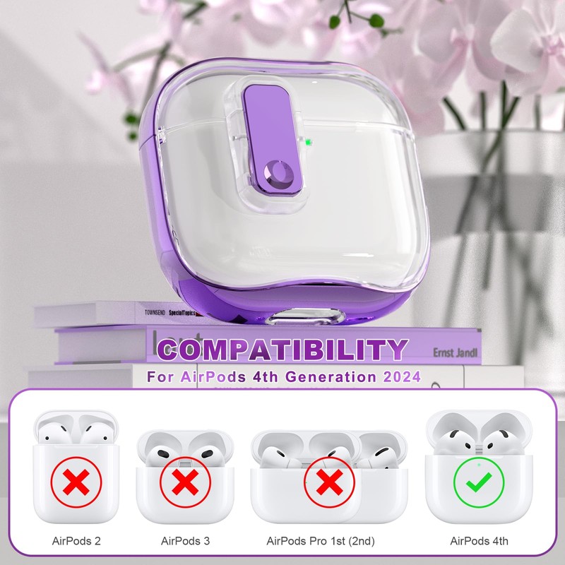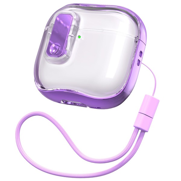 RFUNGUANGO (with Safety Lock) Transparent Protective case for Airpods 4th Generation, Soft TPU Transparent Airpods 4 Protective case - with Cleaning kit, White Lanyard, Purple