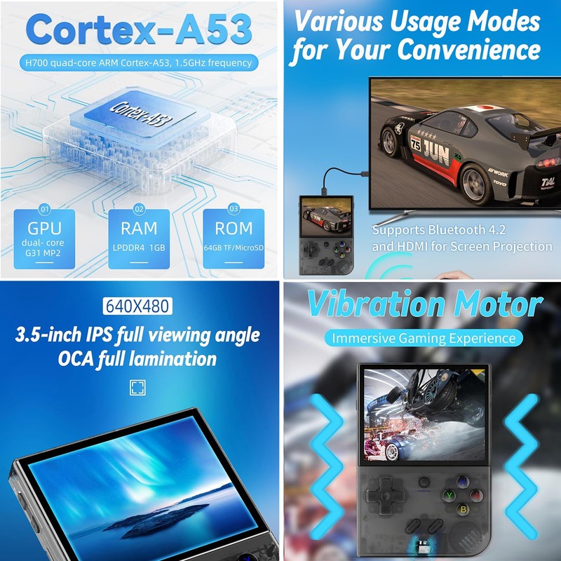 - Powerful Performance:Anbernic RG35XX Plus Equipped with an H700 quad-core ARM Cortex-A53 CPU and 1GB of LPDDR4 RAM (which is smoother than RG35XX), the RG35XX Plus delivers smooth and lag-free gaming experiences. The 3.5-inch IPS full viewing angle screen with zero distance OCA full fit technology ensures stunning visuals.