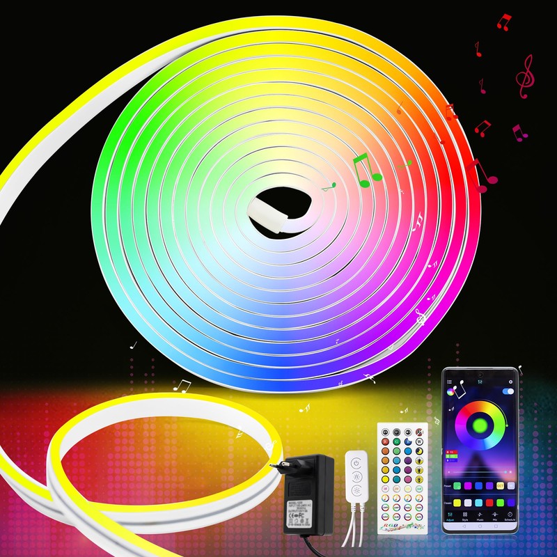 RGB LED Strip 5M, Neon LED Streifen Farbwechsel, Musik-Sync, Wasserdichte, Silikon DIY Flexibler Lichtstreifen mit Fernbedienung, APP Steuerung für Innen und Außendekoration(Inklusive Adapter)