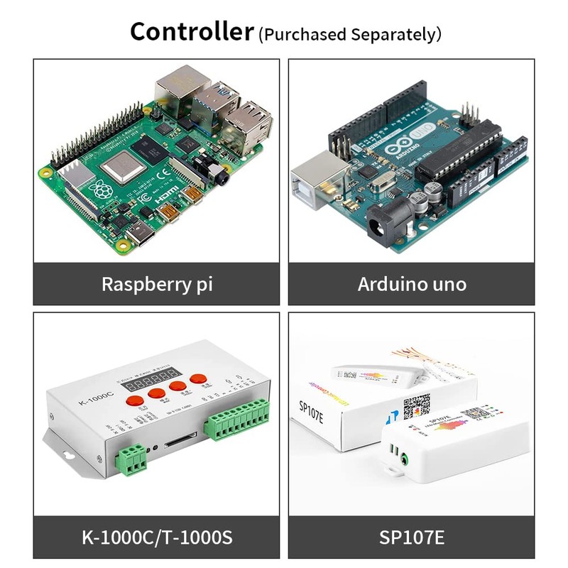 • You will need a 5V power supply and pixel controller, Arduino or other control systems. This allows you to either control colour and brightness independently, or it is beneficial for you to add complex lighting effects to a project.