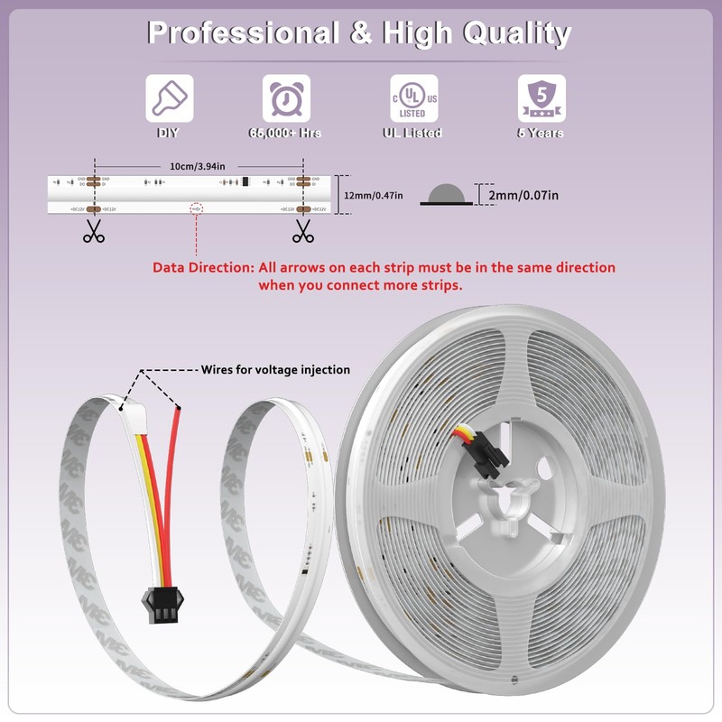 - DC24V Professional Grade: MIWISE 24V RGB Smart IC COB LED Strip provides excellent lighting effects! Each 20-foot roll of light strip provides 3843 LEDs for illumination at the same time, making the LED light strip appear to be continuously glowing. Unlike traditional SMD LED light strips, MIWISE COB LED light strips have almost no black spots, and the 180-degree beam angle can provide a wider lighting range. Professional-grade design improves your project level!