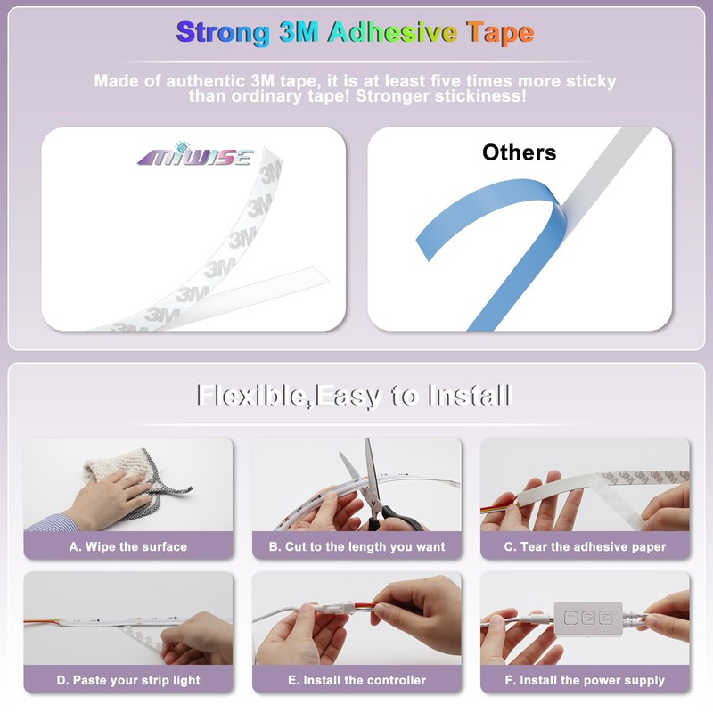 - Easy to DIY: MIWISE RGB Smart IC COB LED Light Strip is very flexible! You can cut the strip every 10 cm/3.94 inches at the cut marks on the strip and you can reconnect the strip at these cut marks by soldering or using the MIWISE 12mm 3-Pin RGB Smart IC COB Connector. There is a strong 55280 3M adhesive on the back of the light strip, which can stick the light strip to any smooth place. Superior flexibility allows you to get the perfect solution for your DIY projects!