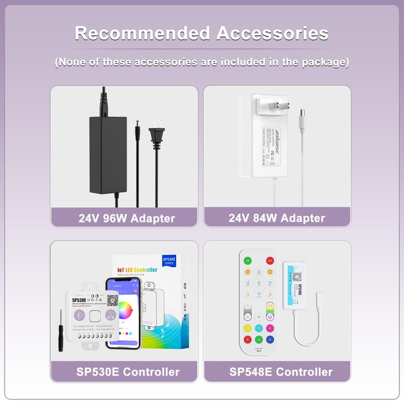- Recommended Accessories: Power supply and controller not included in the package. Compatible with MIWISE SP548E LED controller (search for B0CY1RWJWG), SP530E pixel controller (search for B0CZ733F71). It is recommended to use a 24V power supply with a wattage of 80W or higher. (Recommend MIWISE 84W or 96W power supply, search for B0CY1N5HXL or B0CLTRBRL8)