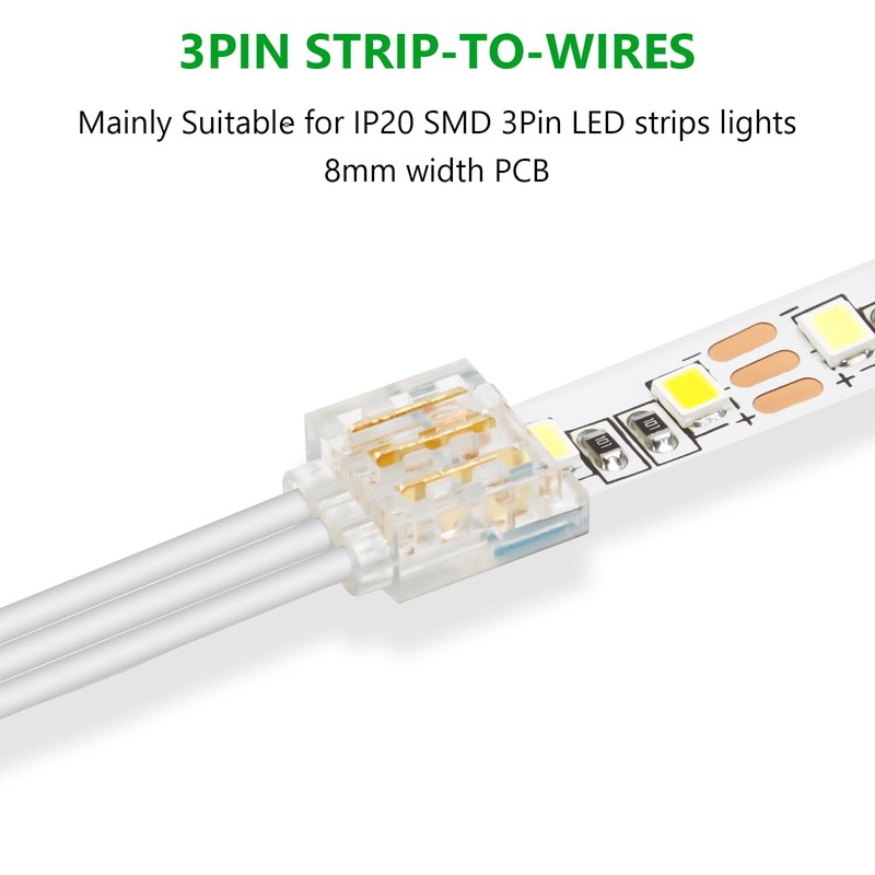 - What you get: 20pcs disposable 3 pin 8mm LED connectors and 10m(32.8ft) 22awg 3 pin extension wire. Compatible with 8mm wide LED non-waterproof strips only, not for 10mm LED strips.