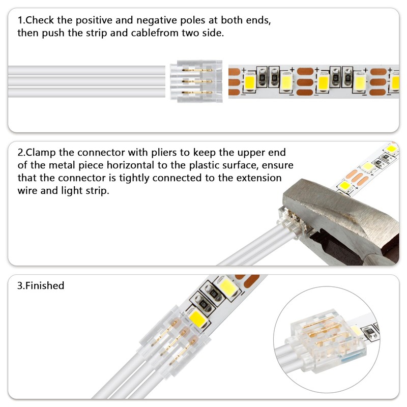- Easy installation: This 3 pin 8mm LED light connector is easy to use without the need for soldering and other processes, simply distinguish between the "+" and "-" terminals of the connector, insert the strip into the connector and clamp the metal connector with pliers.
