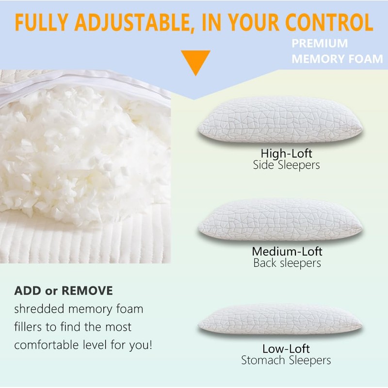 - [ADJUSTABLE Memory Foam Pillow] Too Firm? Too soft? Too thick? Too flat? The shredded foam pillow can adjust to your personal preference for just the right balance of support and comfort. Whether you are a side, back or stomach sleeper, this pillow is for you! Enjoy the most comfortable sleep!