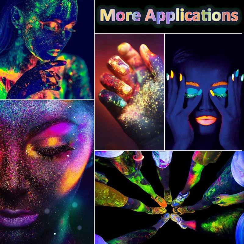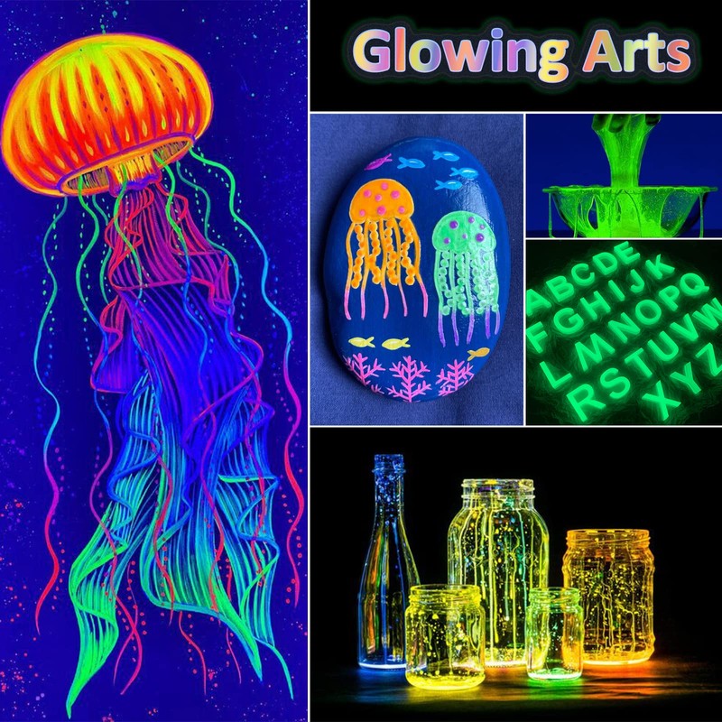 - SAFE & NON-TOXIC: Rhea Arcas luminous powder is non-radioactive, non-irritating, harmless and odorless, which can be used as a pigment powder for body or beauty art in various party activities, also can be used as an additive in following transparent or translucent media to create crafts.