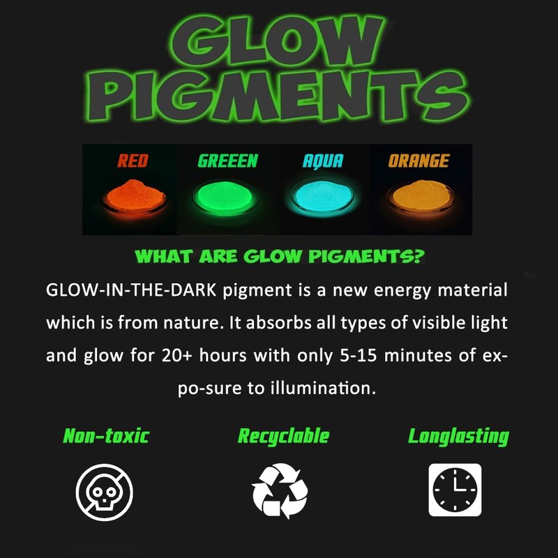 - FULL RANGE USE: Rhea Arcas glow powder provide longer lasting and brighter glow-in-the-dark effect, which are suitable for all transparent coatings and transparent media, such as Slime, Epoxy Resin, Nail Polish, Ink Category, Paint, Plastic Resin, Silicone Rubber, Ceramic, Glass, etc.. Also perfect for glow parties, rave parties, color runs, black-light parties, and other fun night activities. Suitable for Halloween decoration too.