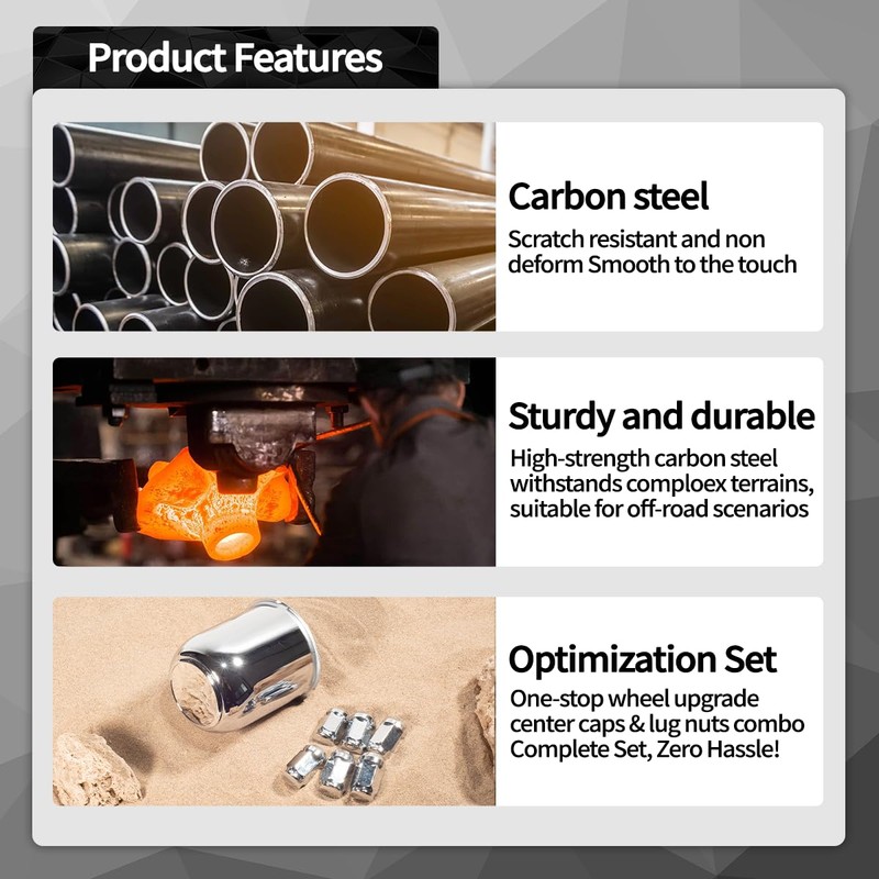 - Premium quality: Trailer wheel center caps are made of carbon steel with chrome plated surface, wheel nuts are made of carbon steel with chrome plated surface. Scratch resistant, durable and smooth to the touch. The centre hub cap creates a special focal point on the wheel and the elegant design enhances the style and appearance of your car.
