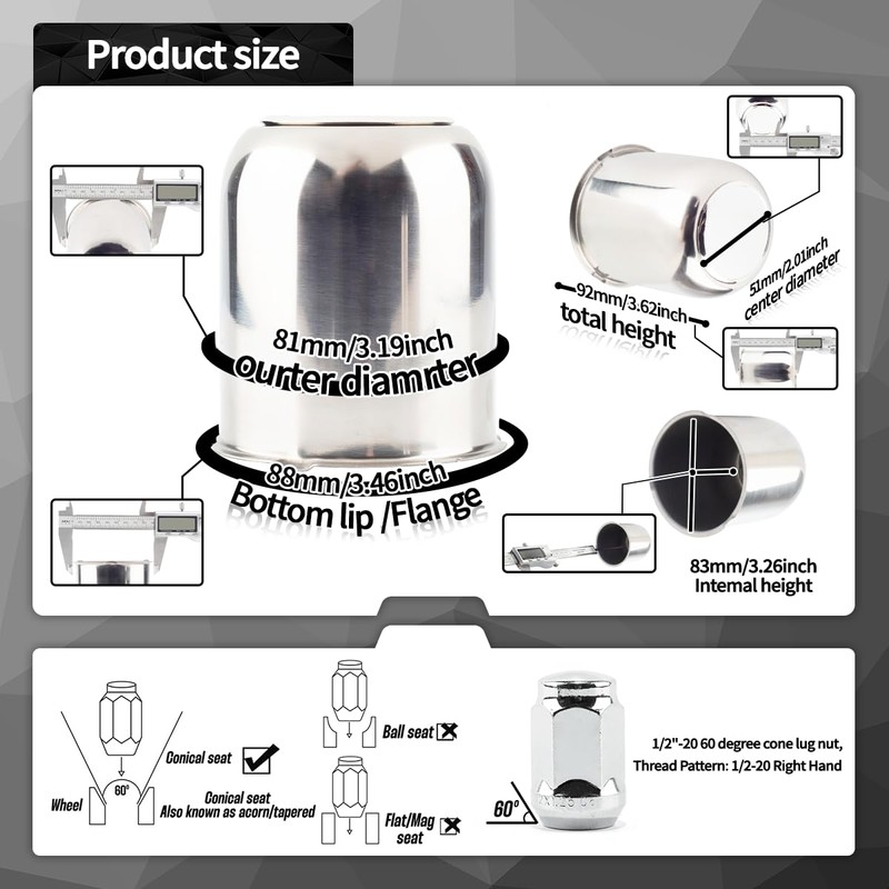 | Size: | 4pcs 3.19" Cap, 24pcs 1/2"-20 Lug Nuts |