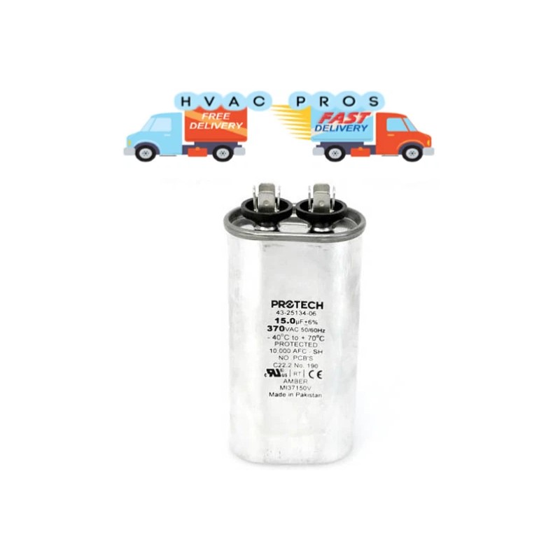 This is a BRAND NEW Rheem/Ruud/Weather King/Corsaire Protech Oval Run Capacitor. The capacitor is oval and rated at 15 uf/MFD and 370 volts (vac). The Rheem/Ruud part# is43-25134-06. If you need a size that we have not listed here, please contact us and we can get you a price and create another listing for that size. Thank you for looking!