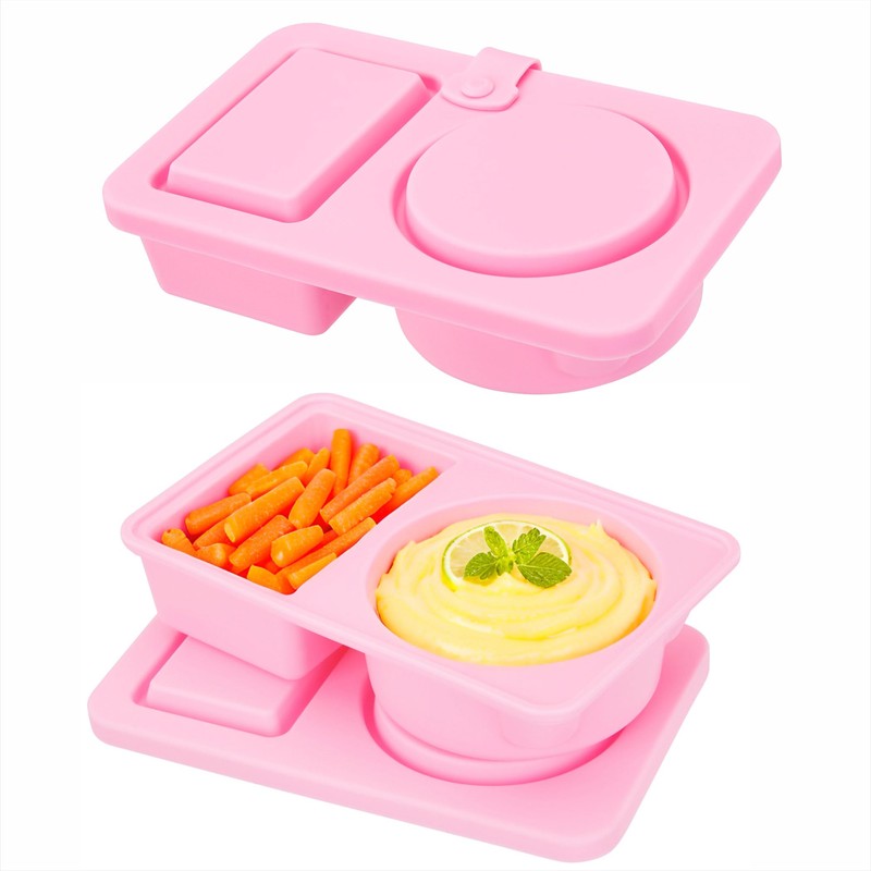 Rhewatin Reusable Silicone Snack Containers with Lids, Silicone Double Compartment Condiment Containers, Sauce Containers for Snack/Salad on the go, 2PC Pink