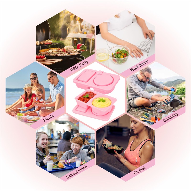 - Compact, Portable & Great for On-the-Go: These reusable silicone snack containers with lids are compact, and perfectly sized for portion. They fit easily into lunchboxes, coolers, making them ideal for travel, work lunches, lunch box and picnic. The round compartment holds 3.38oz liquid, and the square one holds 3oz, suitable for small snacks, small fruits, salad sacue, nuts, condiment etc.