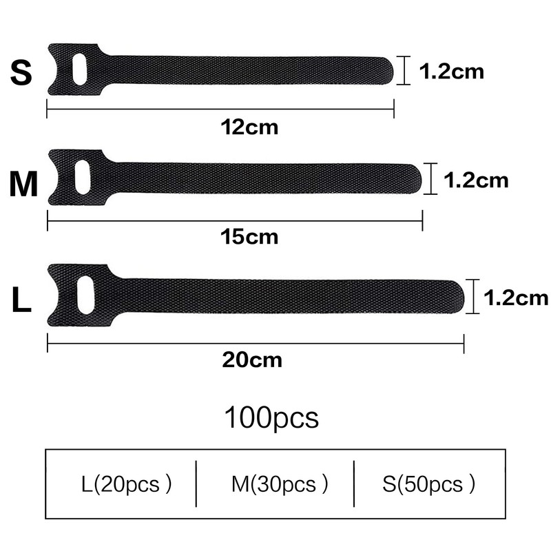- Cable ties Velcro set: 100 pieces Velcro cable ties in 3 different lengths, size: L: 200 mm x 12 mm – 20 pieces, M: 150 mm x 12 mm – 30 pieces, S: 120 mm x 12 mm – 50 pieces. This set of Velcro cable ties can organise all loose cables, different lengths for different devices.