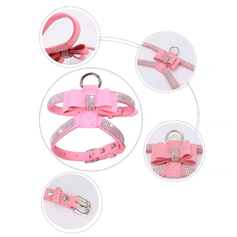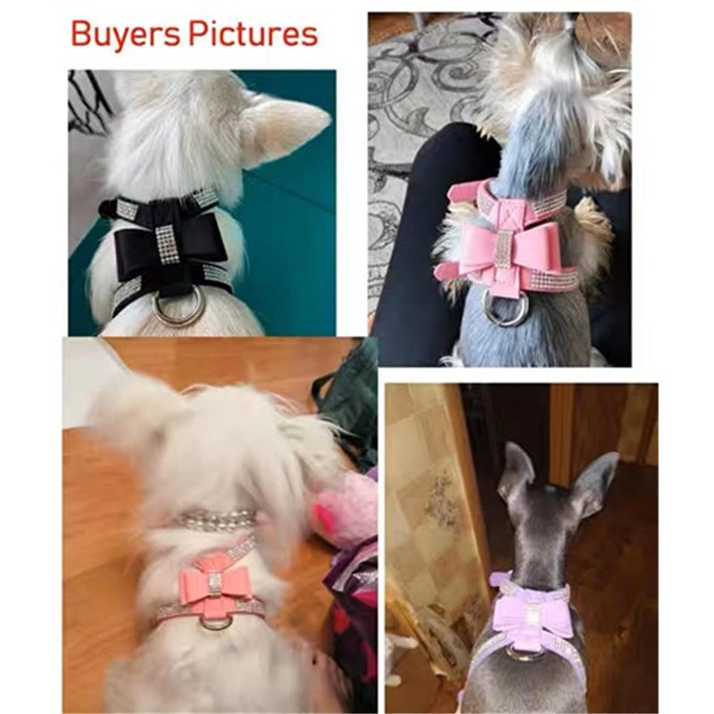 - Sparkling Rhinestone Dog Harness - Made of suede microfiber material with breathable mesh lining on the back for added comfort, wear, skin-friendly. Large area with small diamonds and bows on the back to make your pet more cute and charming.