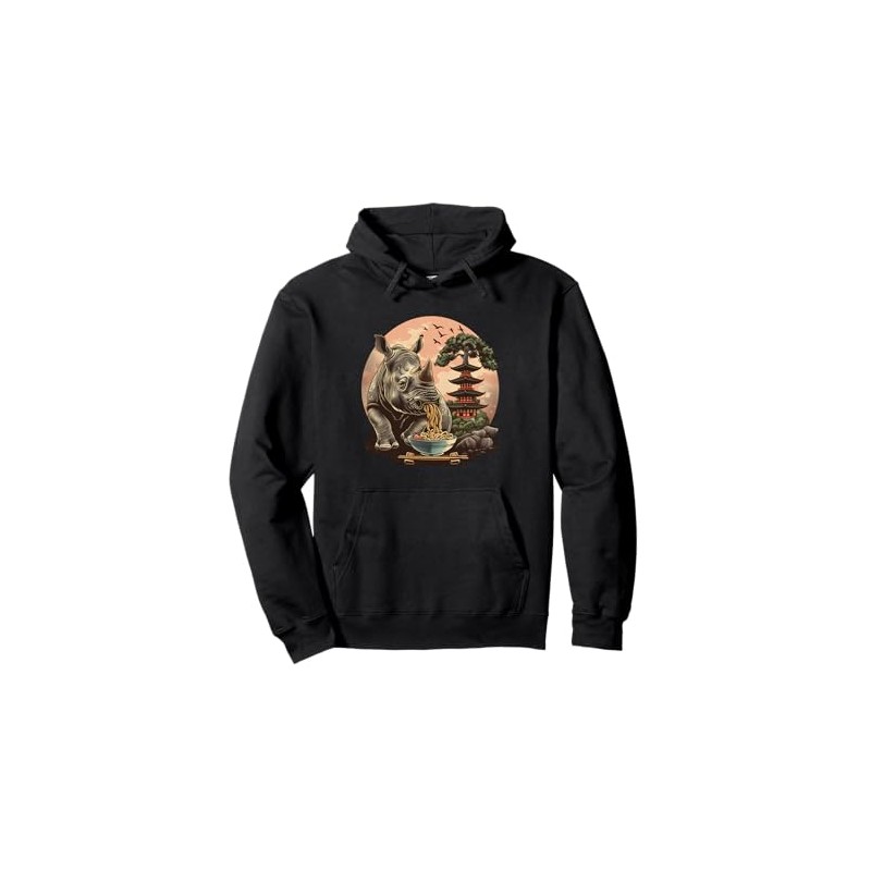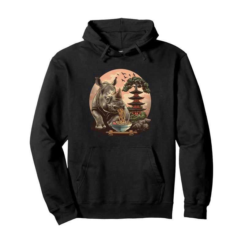 Rhino Eating Ramen Pagoda Tower Bonsai Tree Animal Art Pullover Hoodie