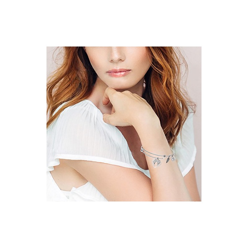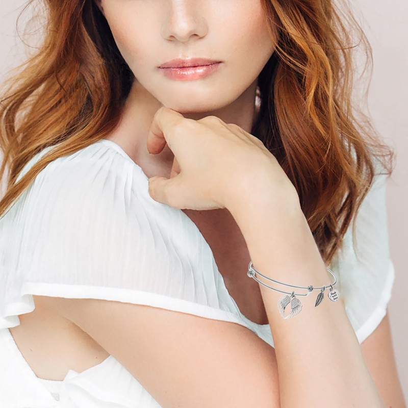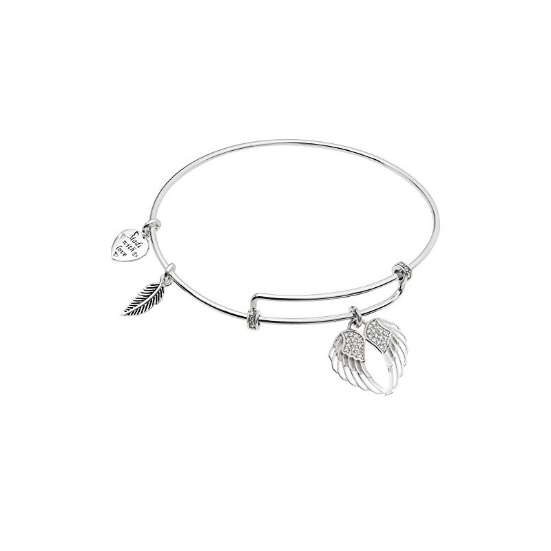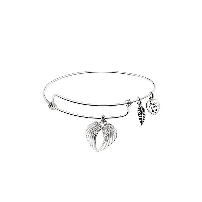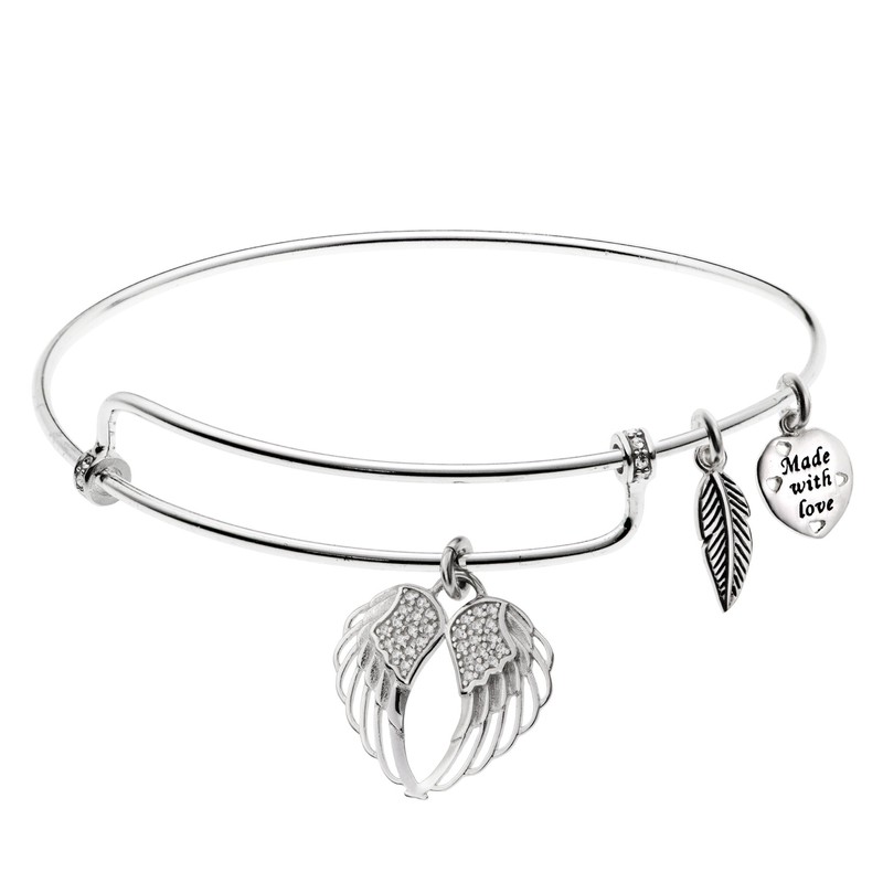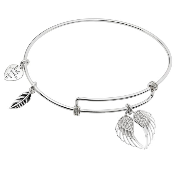 Rhodium On 925 Sterling Silver Angel Guardian Wing CZ Heart Feather Dangle Charm Bangle Bar Bracelet