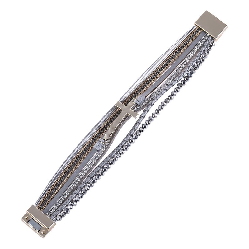 RIAH FASHION Bohemian Faux Leather Wrap Multi Layer Bracelet - Cross Leatherette Rhinestone Metallic Bead Bangle (Multi Metallic Cross - Silver)