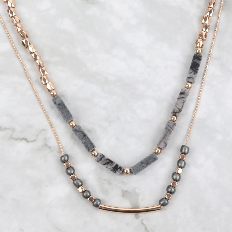 - PRODUCT DETAILS - A layered natural stone necklace featuring earthy stones with gold-tone accents, creating a gorgeous piece. Wear over simple tops to really make a statement. MATERIAL: CCB, Natural Stone. MEASUREMENTS: CARE INSTRUCTIONS: Limit exposure to water, perfume or body cream to extend the life of your jewelry