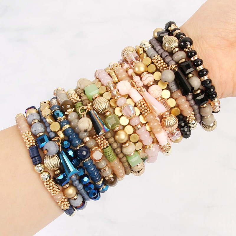 - PRODUCT DETAILS - A multi bead bracelet full of color and fun! Great for this Spring and Summer season. Stretch bracelets adorned with stylish beads. Wear separately or stack them up for a unique look. MATERIAL: Base Metal, Acrylic Beads, Natural Stone. MEASUREMENTS: 2.125" Diameter. CARE INSTRUCTIONS: Limit exposure to water, perfume or body cream to extend the life of your jewelry