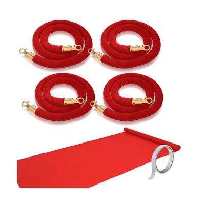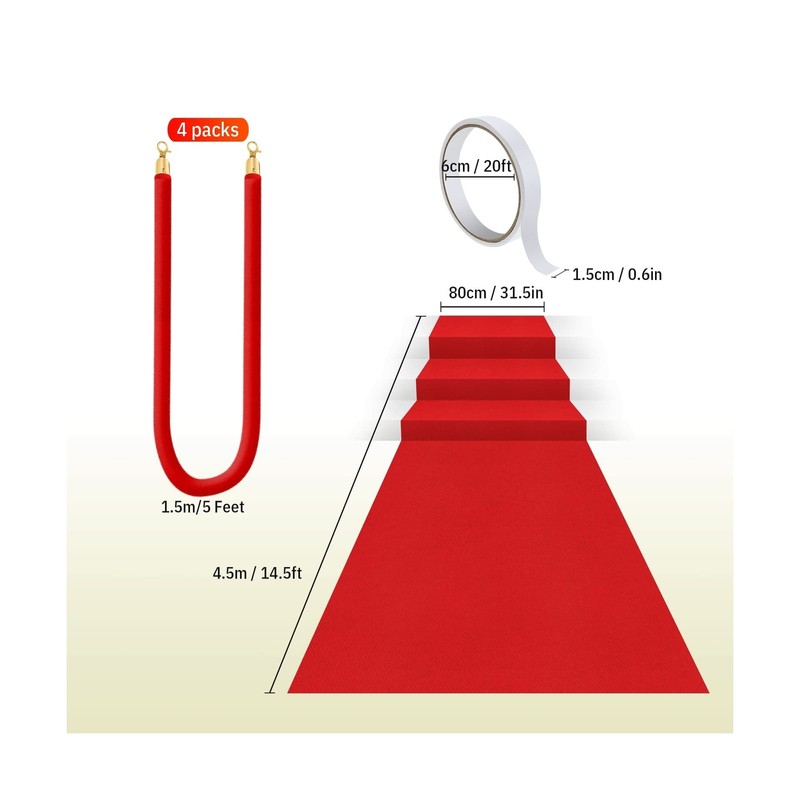 • Nice combination for decorating you special events: you will receive 4 red barrier ropes with the size of 1.5 m/ 5 feet in length, 1 pieces of 2.6 x 15 feet 55gsm thickness red runner carpet and 1 roll of carpet tape, a complete party decoration combination to meet your fairs and parties need and bring convenience to your decorating process