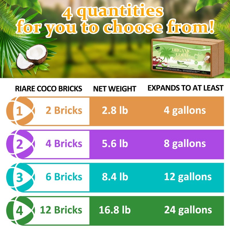- 【Premium Material】Environmental option, gorgeous texture! 100% natural compressed coco peat brick with low EC, balanced pH, high expansion, and excellent breathability. Riare coconut fiber substrate absorbs & retains moisture really well, perfect for soil that needs drainage. Makes a lot of soil with a little brick, best garden soil substitute!