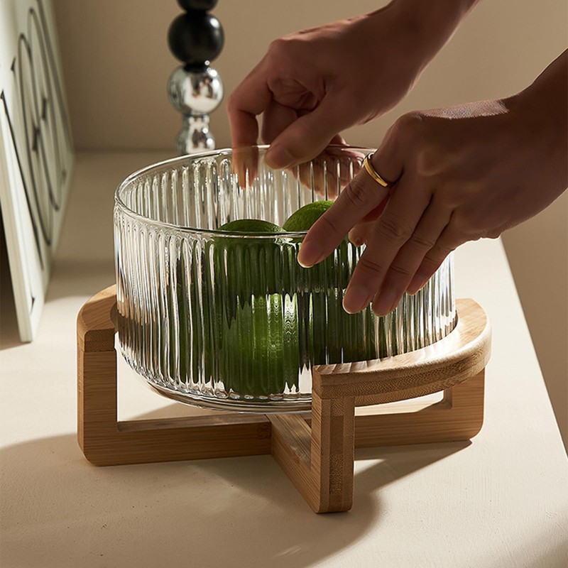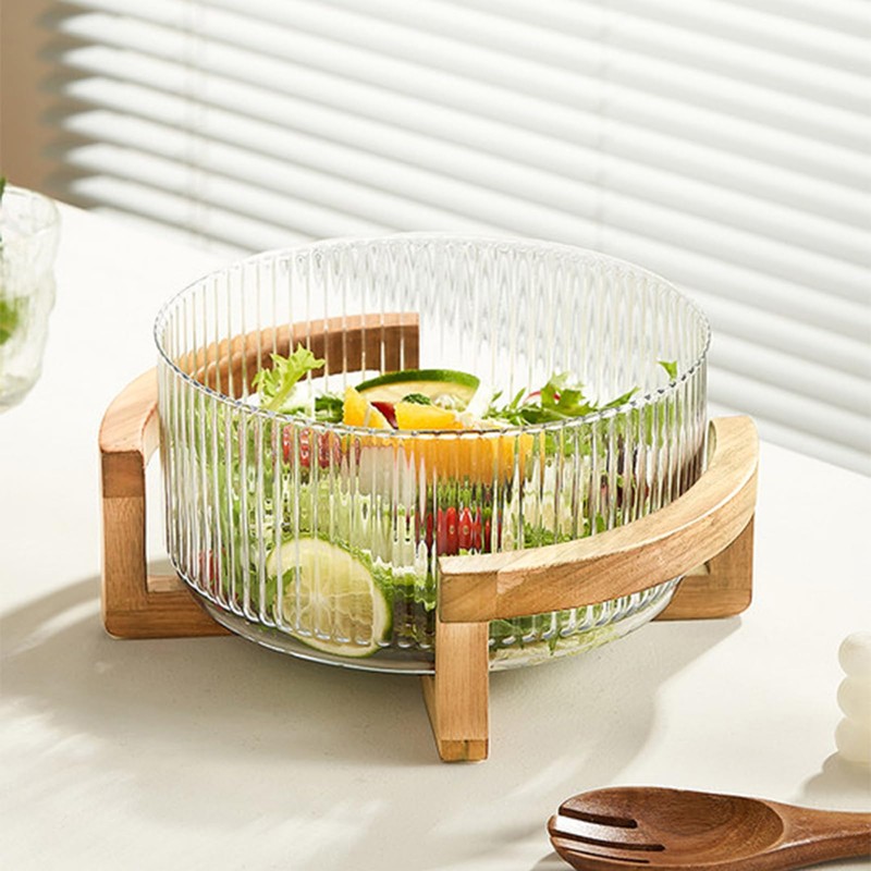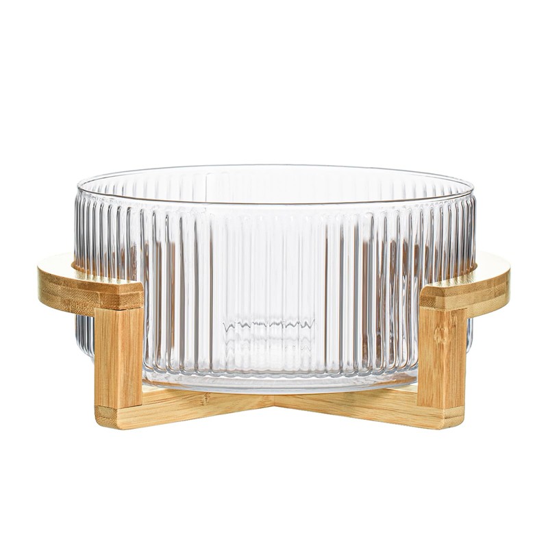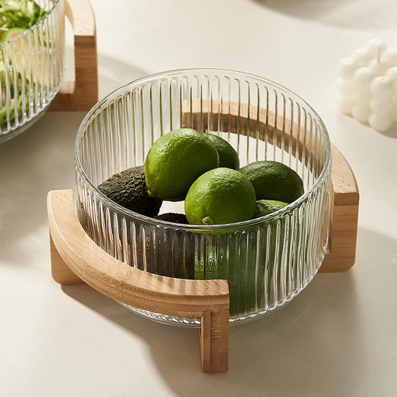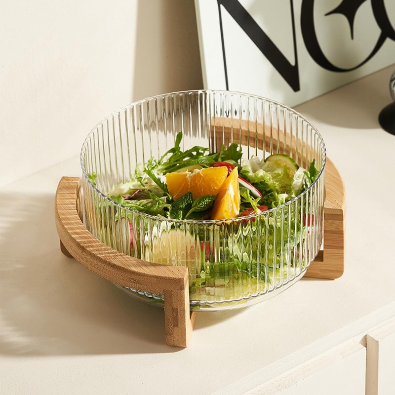 Ribbed Glass Salad Bowl with Wooden Stand – Large Mixing Bowl for Serving Salad, Fruits, Pasta & Desserts – Elegant Glass Serving Bowl with Natural Bamboo Holder – Modern Kitchen & Dining Tableware