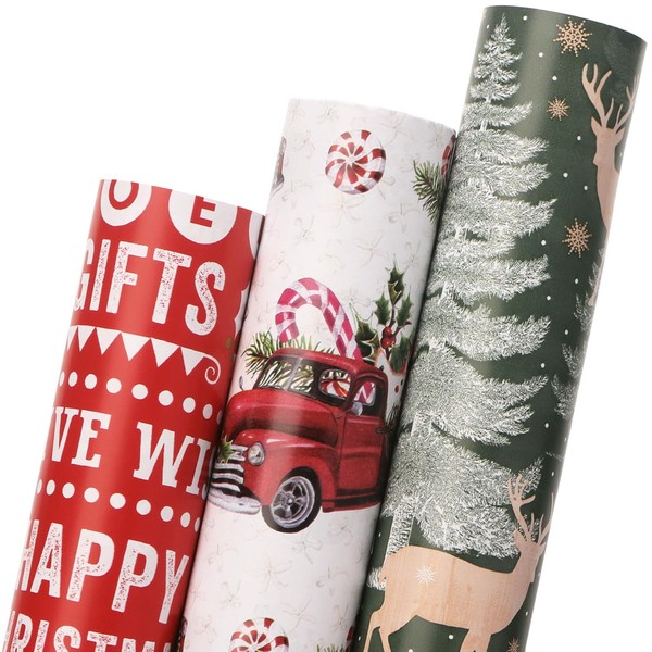 Ribbli Christmas Wrapping Paper 3 Rolls Red Truck Reindeer Christmas Tree Printed Assortment - Mini Roll 17 inch x 120 inch(10feet) Per Roll