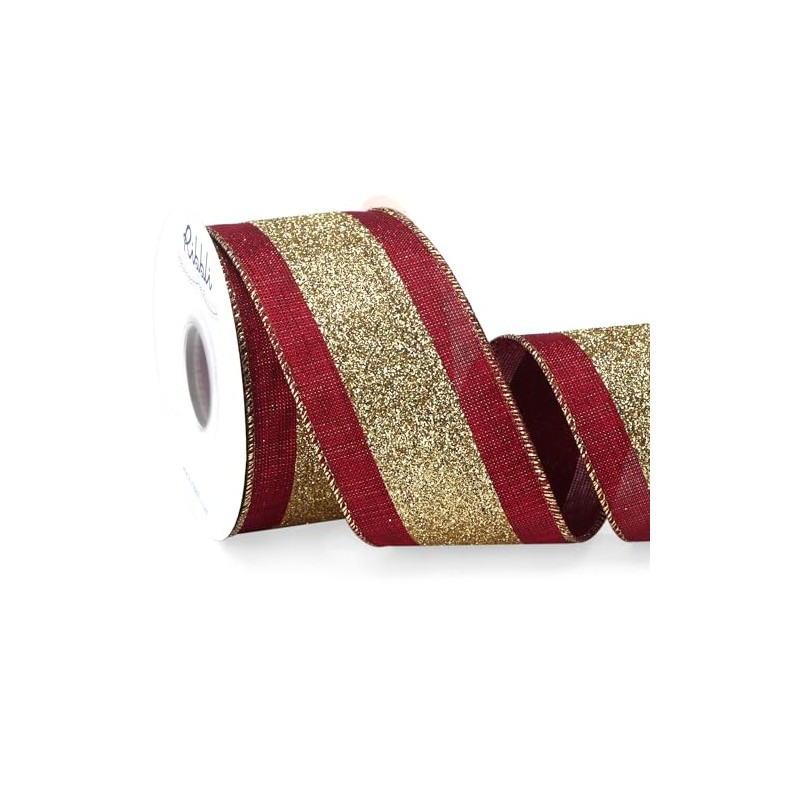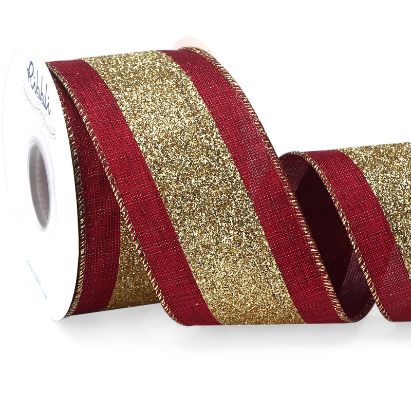 Ribbli Metallic Dark Red Linen with Gold Glitter Wired Ribbon 2-1/2 Inch x Continuous 10 Yard Red Burlap Ribbon with Gold Stripe Christmas Ribbon for Tree Decoration Wreaths Big Bow Gift Wrapping