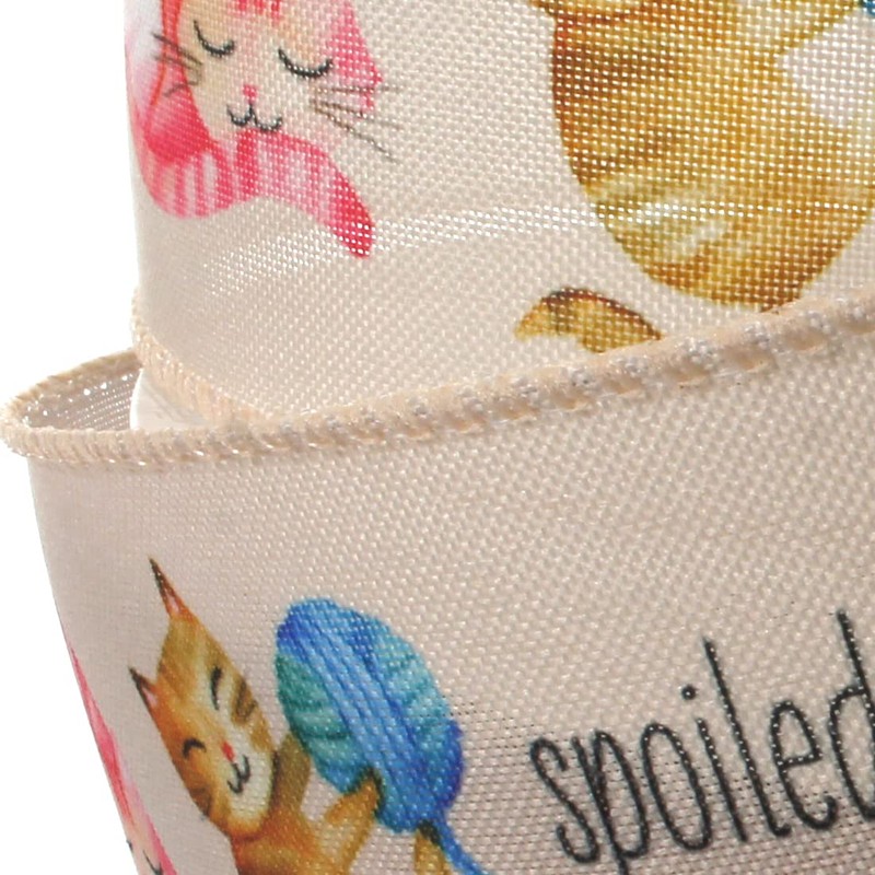 Constructed of a woven ribbon base with a cat's life print design on a natural background. This ribbon would make a beautiful addition to packaging gifts, floral arrangements, and pet-themed decor such as adding to garlands, trees, wreaths, etc.