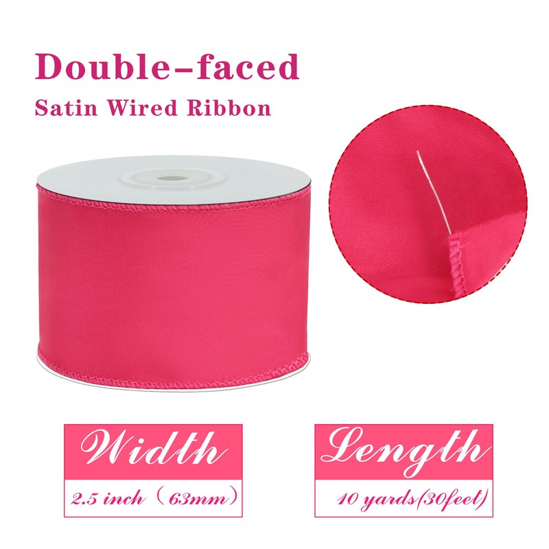 RIBBOOO Hot Pink Wired Ribbon 2.5 inch inch x 10 Yards Double-Faced Satin Wired Edge Ribbon for Bows Flowers Gift Wrapping Wreaths Baby Shower DecorWedding DIY Crafts Continous