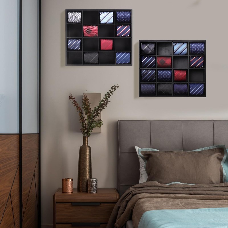Ribgwo Tie Organizer Wall Mounted Tie rack,Tie box for Men,Tie Box Organizer with 16 Compartments,Tie Display Racks for Bedroom, changing room, Men Wardrobe(Black,2 PCS)