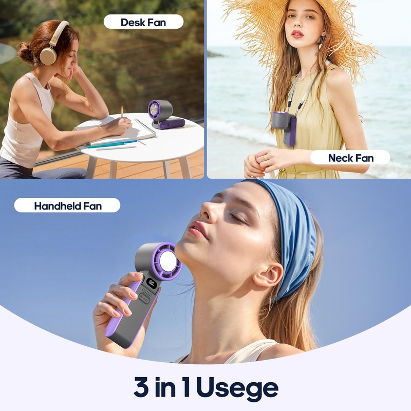 - 3 IN 1 Hand Fan:Hang it around your neck for hands-free cooling or use it on your desk for a focused breeze; Its innovative design allows for handheld use, desktop placement, or worn around the neck, providing a 3-IN-1 solution for beating the heat