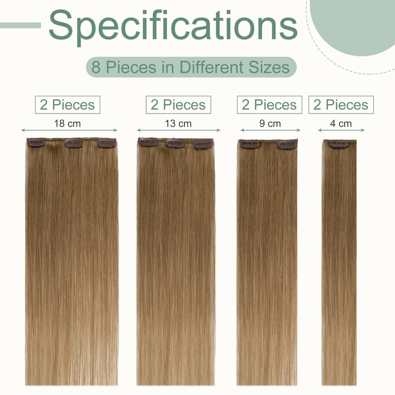 - Thin weft clip-in extensions: these clip-in real hair extensions come in 8 hair extensions with 18 clips, including 2 replacement clips. Hair weights from 45 g to 70 g, length from 20 cm to 60 cm. For hair thickening, we recommend buying 1-2 sets for a normal volume, 2-3 sets are recommended for a full head look; for adding both length and volume, 3-4 sets are recommended.