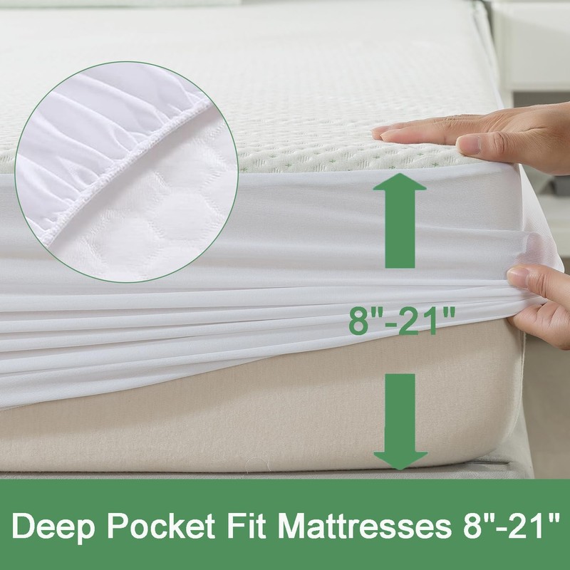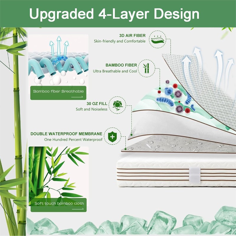 - Cooling bamboo material: our mattress protector extracts fibres from natural bamboo, is ultra-soft and skin-friendly. The special fabric structure made of bamboo fibres provides a cooling effect that distributes heat evenly and regulates body temperature. Our breathable protective membrane provides air circulation to keep you cool and ventilated. Let you sleep worry-free.