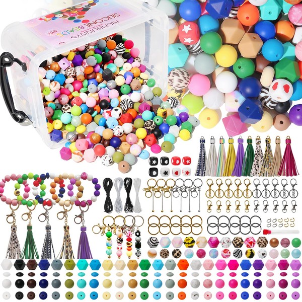 Richbunnys 734+71pcs Silicone Beads Kit: 15MM Hexagon Lentil Round Beads with Key Rings and Tassels for Pens, Bracelets, Necklaces, Lanyards