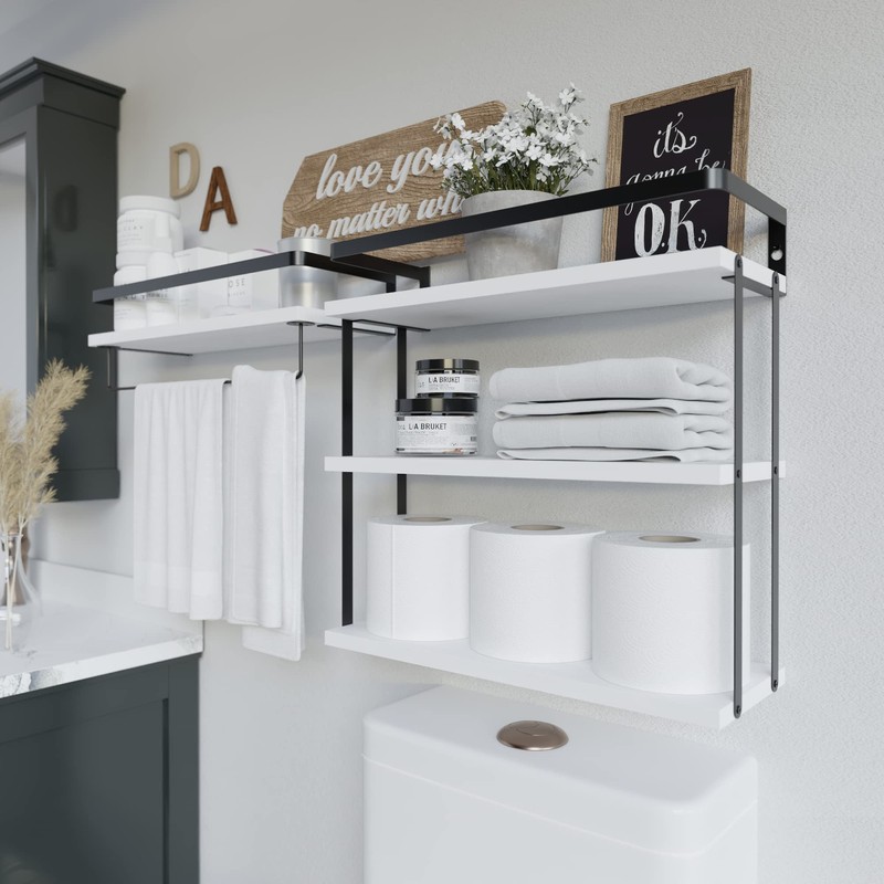 RICHER HOUSE 3+1 Tier Wall Mounted Floating Shelves Set of 2, Rustic Wood Wall Shelf with Metal Frame, Extra Storage Rack for Bathroom, Kitchen, Bedroom with Tissue Rack & Towel Bar - White