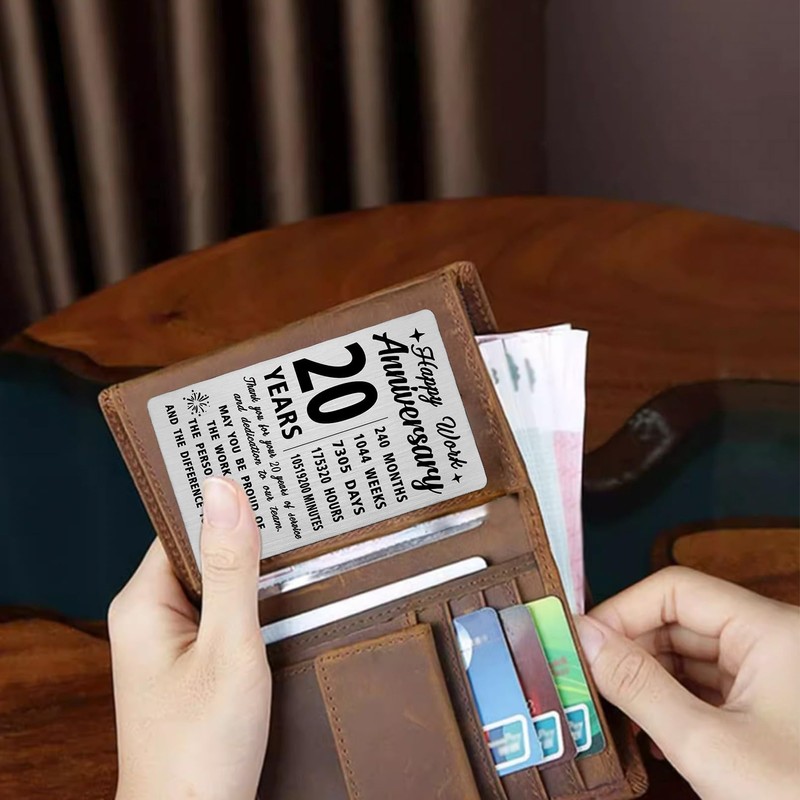 - Engraved Appreciation Note - The wallet card is engraved with a heartfelt message: "Happy anniversary 20 years, 240 months, 1044 weeks, 7305 days, 175320 hours, 10519200 minutes. Thank you for all your years of service and dedication to our team. May you be proud of the work you do, the person you are, and the difference you make." This note serves as a constant reminder of their valued contributions