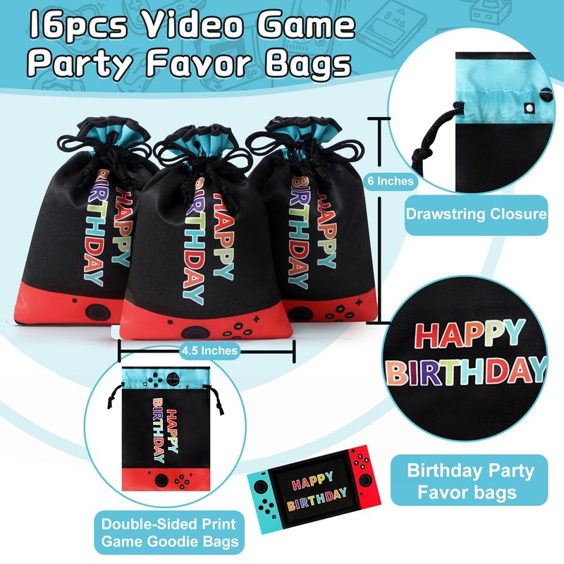 - Video Game Party Favor Bags-Add a touch of excitement to your video game-themed birthday party. These gaming party favor bags are perfect for filling with a variety of goodies for your guests, such as mini figures, small toys, stickers,candies and other sweet treats. Create an unique birthday bash for your fellow gamers.